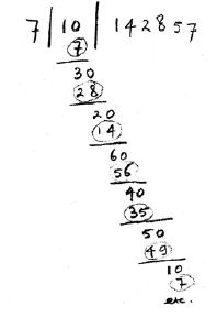 Allow me to make an interesting observation of the kinds of things we seem to take for granted in basic arithmetic: In the handwritten figure at left, I have revealed the simple calculation of the reciprocal of 7, which we already saw is 0.142857…
