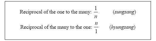 I will continue to use the term reciprocal in the traditional standard definition way (1/n), as there is no need to write “regular” hyungsang numbers as n/1. We just keep these dual aspects in our mind.